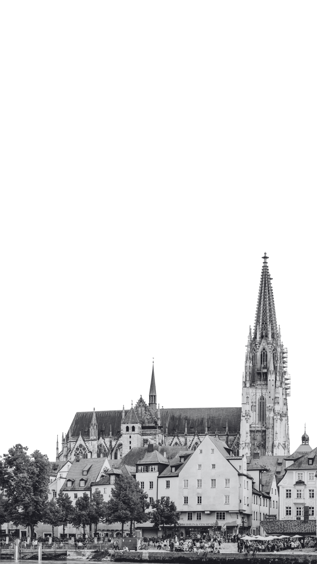 Schwarz-Weiß-Foto einer historischen Stadt mit einer großen gotischen Kathedrale im Hintergrund, umgeben von traditionellen Gebäuden und Bäumen, mit Menschen, die am Flussufer spazieren und am Markt sitzen.