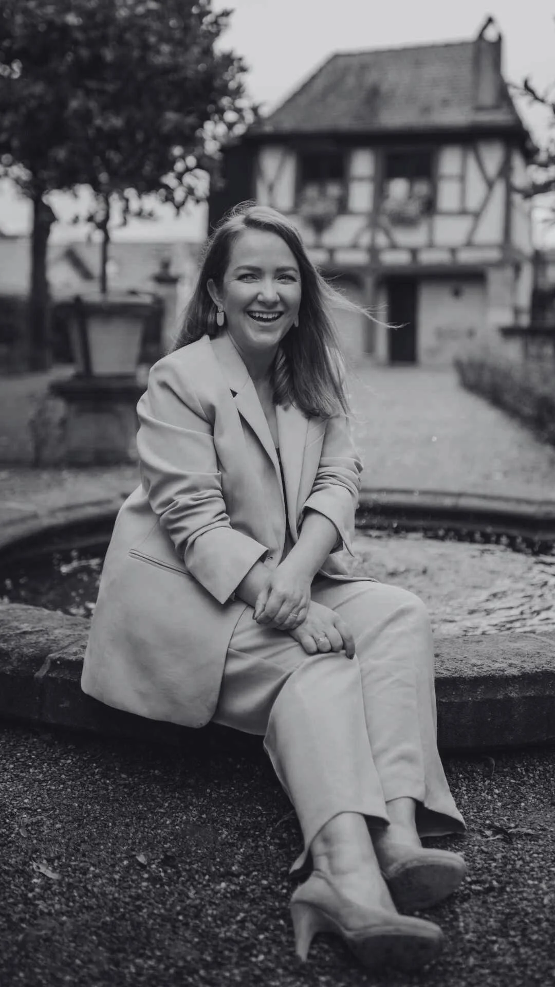 Eine lachende Anna Benz-Reichenauer in einem hellen Anzug und hohen Schuhen sitzt an einem Brunnen im Freien, im Hintergrund ein Haus im Fachwerkstil und Bäume.