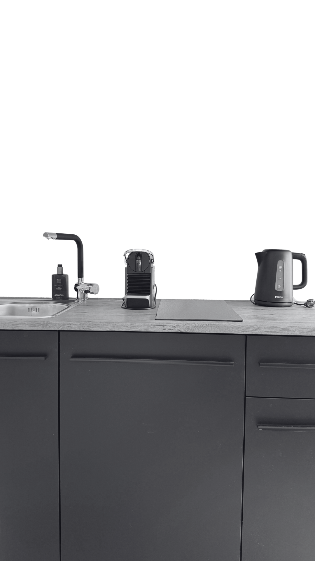 Moderne Küchenzeile mit Wasserhahn, Kaffeemaschine, Schneidebrett und Wasserkocher in schwarzem Design