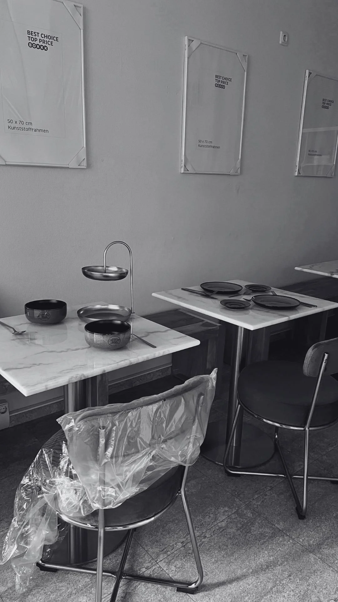 Leerer Essbereich mit sieben schwarzen Tellern und drei schwarzen Schüsseln auf Tischen mit weißen Oberflächen. Es befinden sich auch zwei Stühle, einer mit einer Plastiktischdecke. Die Wand im Hintergrund hat mehrere leere Rahmen und einen leisen Schalter.